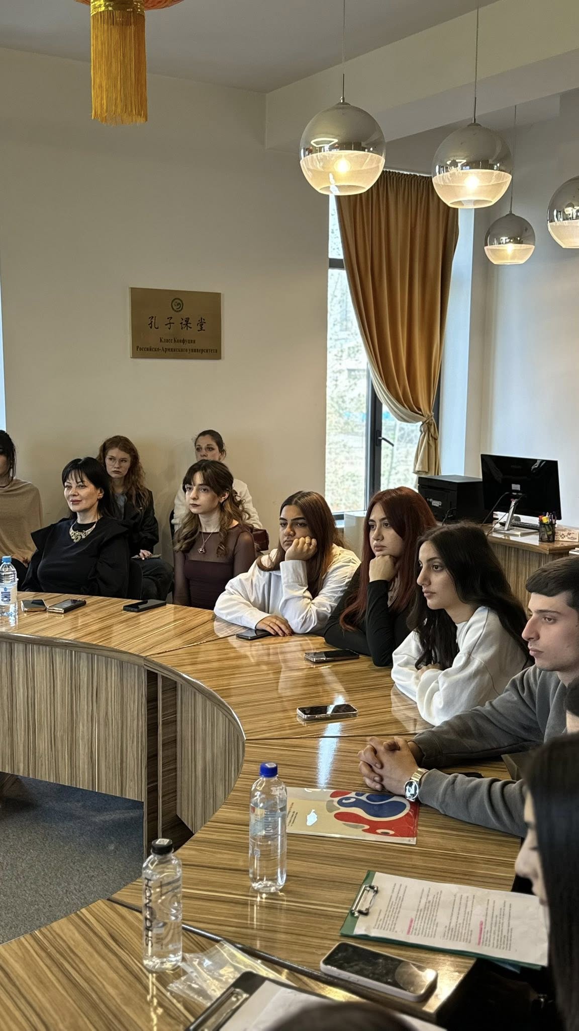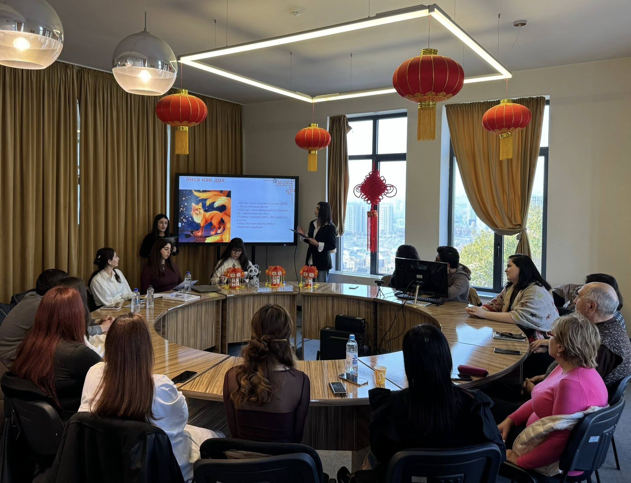 Целью мероприятия было исследование того, как мифологические существа китайской традиции — от драконов до девятихвостых лис — продолжают формировать культурное воображение современного человека, выступая посредниками между сакральным и рациональным, верой и страхом, эстетикой и опытом. В центре обсуждения оказался вопрос о том, как миф, переживший тысячелетия, остаётся живым языком культуры, способным говорить о природе человека и устройстве его сознания. Гости - студенты-лингвисты во главе с завкафедрой теории языка и межкультурной коммуникации РАУ Армине Симонян - своим живым интересом и активной вовлеченностью в дискуссию сделали мероприятие еще ярче и насыщеннее.